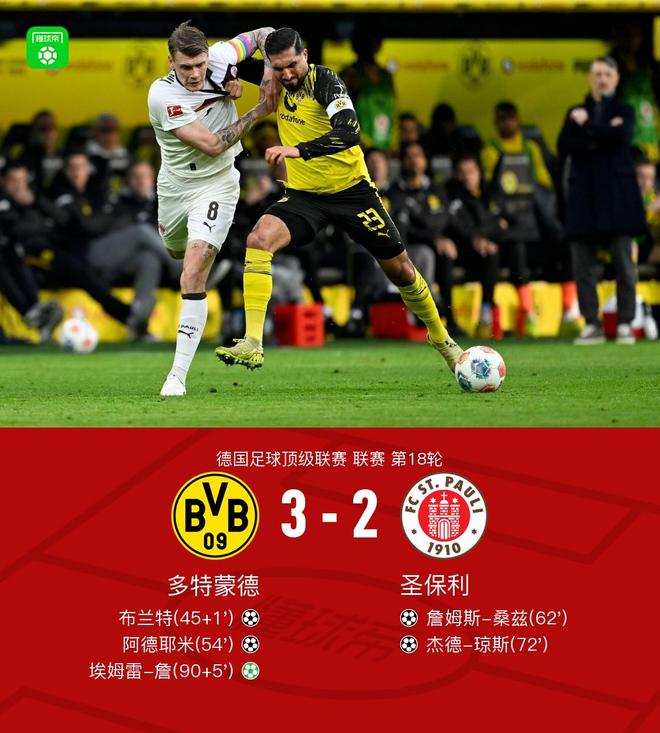 北京时间1月17日,德国足球甲级联赛第18轮,多特蒙德坐镇主场迎战圣保利。上半场补时阶段,阿德耶米送出助攻,布兰特冷静破门,为主队先拔头筹。易边再战,法比奥-席尔瓦送出关键传球,阿德耶米接球后攻门得手,将比分扩大。此后圣保利展开反击,埃里克-史密斯先后两次送出助攻,詹姆斯-桑兹与杰德-琼斯接连破门,帮助客队连追两球,将比分扳平。比赛进入伤停补时阶段,多特蒙德获得点球机会,埃姆雷-詹主罚命中,完成绝杀。最终全场比赛结束,多特蒙德以3比2战胜圣保利。